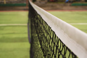Tennis court net in warm sunlight. Tennis court divider. Opposite sites of competitors on tennis court. Summer day in tennis club. Outdoor sport and active lifestyle concept. Green field for game